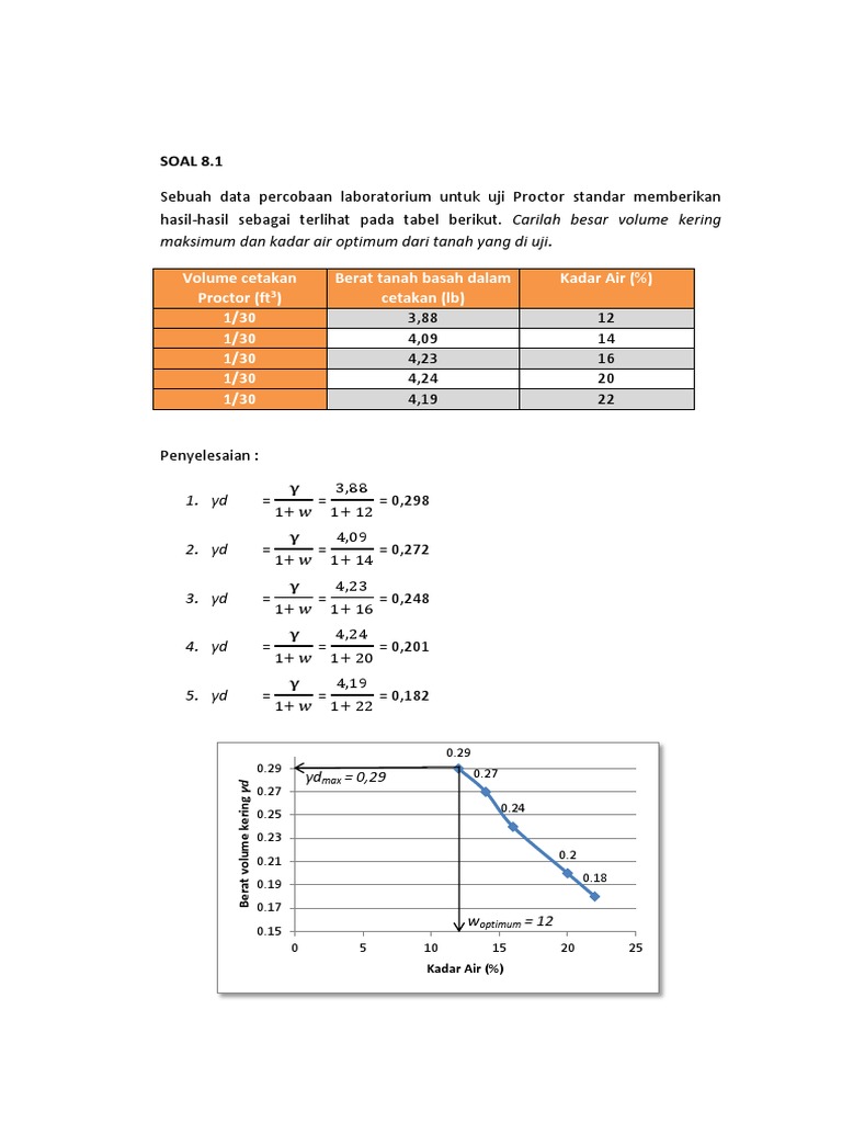 Mekanika tanah kriteria keruntuhan mohr coulomb universitas. Cetakanvolume penumbuk jatuh tinggi penumbuk berat lapisan jumlah pelapisan tumbukan jumlah e = bila usaha pemadatan per satuan volume tanah berubah, kurva pemadatan juga akan berubah, seperti pada gambar 8.7, yang menunjukkan 4 buah kurva. Tanah pada titik b terletak langsung di bawah poros roda lihat gambar. Akibatnya terjadi pencemaran tanah dan tanah menjadi tidak subur lagi. Dalam keadaan asli, suatu tanah basah memiliki volume 0.009345 m3 dan berat 18.111 kg. Agronomi, komoditas, kultur, pupuk, media, dan bahan tanam 1. Kadar air = 30%, dan spesific gravity =2,50. Pada kondisi di lapangan tanah mempunyai volume 10 cm 3 dan berat basah tanah 18 gr. 30 soal benar salah & 10 soal pilihan ganda + kunci jawaban contoh soal uts dasar budidaya tanaman : Berikut ini adalah soal pencemaran tanah dan jawabannya yang dapat kamu pelajari secara mandiri untuk menambah pengetahuanmu untuk selalu menjaga kesehatan lingkungan. Pemilihan bahan timbunan sesuai dengan kriteria. Contoh yang banyak ditemui adalah roler (stum) pada pekerjaan pemadatan tanah jalan. Berat penumbuk adalah 5,5 lb (massa = 2,5 kg) dan tinggi jatuh sebesar 12 in.