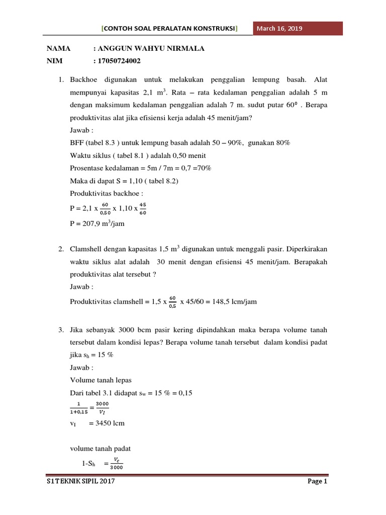 Mengetahui dan memahami prosedur pengujian kerucut pasir ( sand cone ) 2. Jumlah tumbukan adalah 25 x setiap lapisan. Mekanika tanah kriteria keruntuhan mohr coulomb universitas. Ruang lingkup pedoman ini mencakup kegiatan penggalian, penanganan, pembuangan atau penumpukan tanah atau batu atau bahan lain dari sumber bahan yang diperlukan untuk penyelesaian dari pekerjaan dalam kontrak ini untuk pekerjaan galian. Setelah dikeringkan dalam oven , berat tanah kering adalah 15.667 kg. Material untuk zone inti bendungan, zone tirai, dll sesuai dengan persyaratan. 5ntuk mengetahui berat olume tanah di lapangan, dilakukan pengu(ian keru#ut pasir (snd c&ne)& tanah seberat 0,.' kg digali dari lubang di permukaan tanah& <ubang di isi dengan $,.0 kg. Pemilihan bahan timbunan sesuai dengan kriteria. 7 m3 = 27,7 dibulatkan menjadi 28 truck. Hasil pemadatan di lapangan diuji dengan sand cone diperoleh data sbb: Banyaknya contoh soal dimaksudkan agar para pembaca baik mahasiswa konsultan maupun dosen dapat dengan mudah mempelajarinya. Energi pemadatan • dihitung dengan persamaan berikut (bowles, 1986) : Contoh soal dan jawaban teknik sipil sumber.